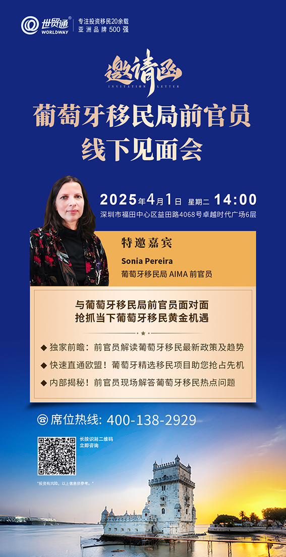 葡萄牙移民局前官员线下见面会2025年4月1日• 世贸通• 534 阅读 详询咨询 中国内地: 400-138-2929中国香港客服中心: (852)2802-8798 投资有风险,以上信息供参考 上一篇美国知名大律师访问世贸通:独家解读川普移民热点下一篇紧急通知!美国驻上海总领馆签证预约将受限