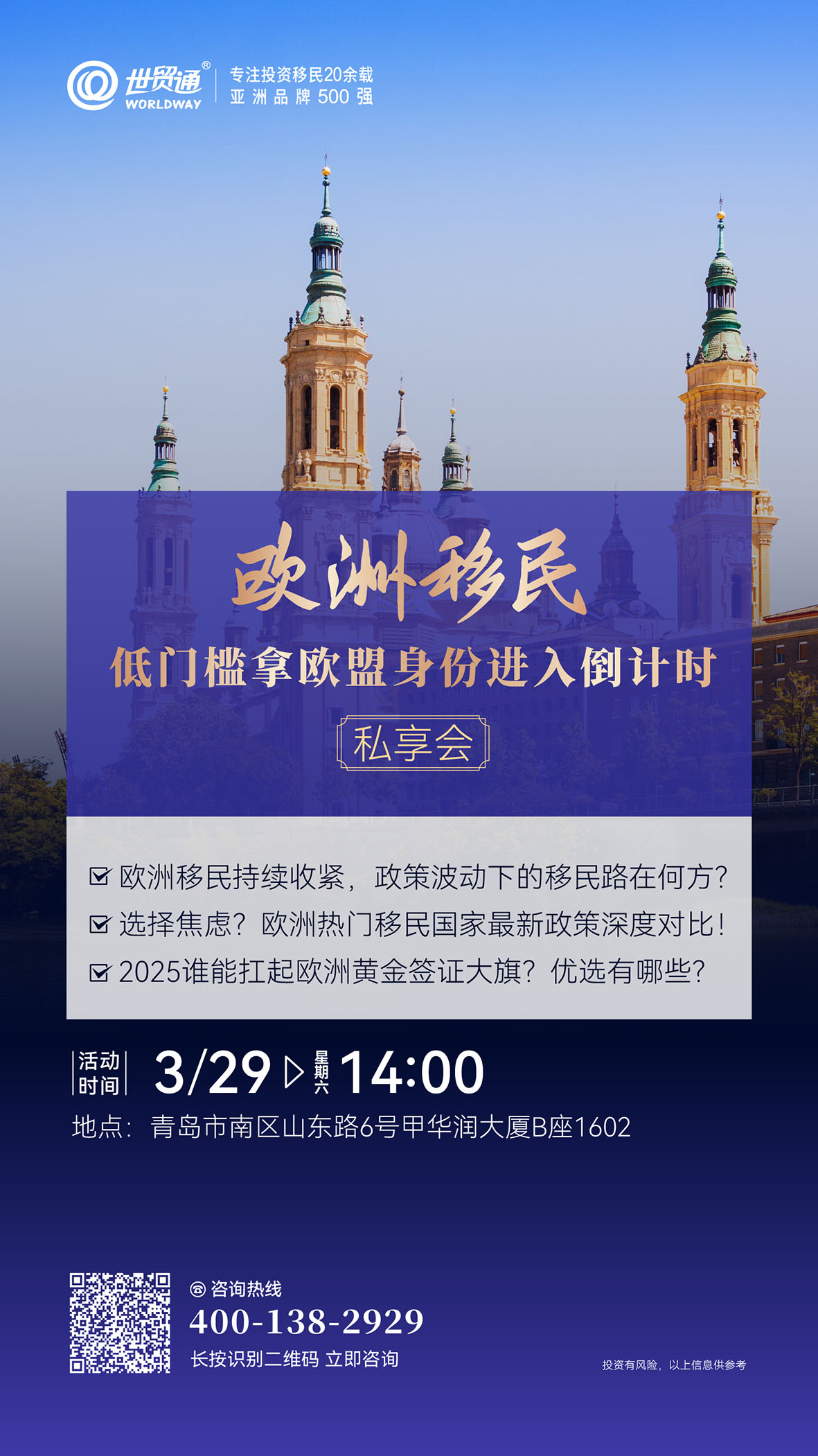 欧洲移民 低门槛拿欧盟身份进入倒计时2025年3月29日• 世贸通• 702 阅读 详询咨询 中国内地: 400-138-2929中国香港客服中心: (852)2802-8798 投资有风险,以上信息供参考 上一篇葡萄牙 轻松拿欧盟护照下一篇加拿大萨省省提名项目重磅变政
