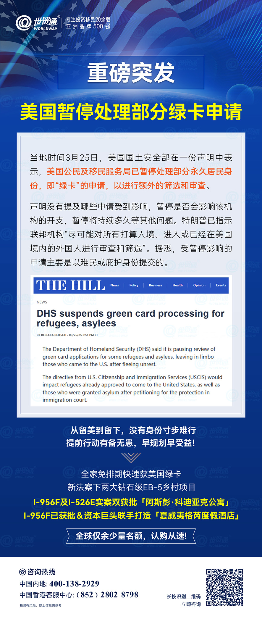 当地时间3月25日,美国国土安全部在一份声明中表示,美国公民及移民服务局已暂停处理部分永久居民身份,即“绿卡”的申请,以进行额外的筛选和审查。