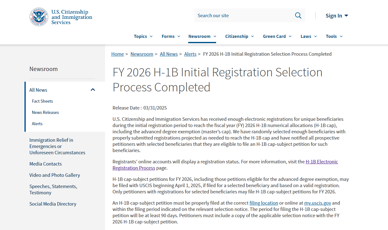 移民局表示,在初始注册期间收到了足够的电子注册申请,以满足2026财年H-1B名额(H-1B 配额),包括高级学位豁免(硕士配额)。已随机选取了足够数量的合格受益人,以满足H-1B配额需求,并已通知所有具有入选受益人的潜在申请人,他们可为这些受益人提交 H-1B 配额受限的申请。