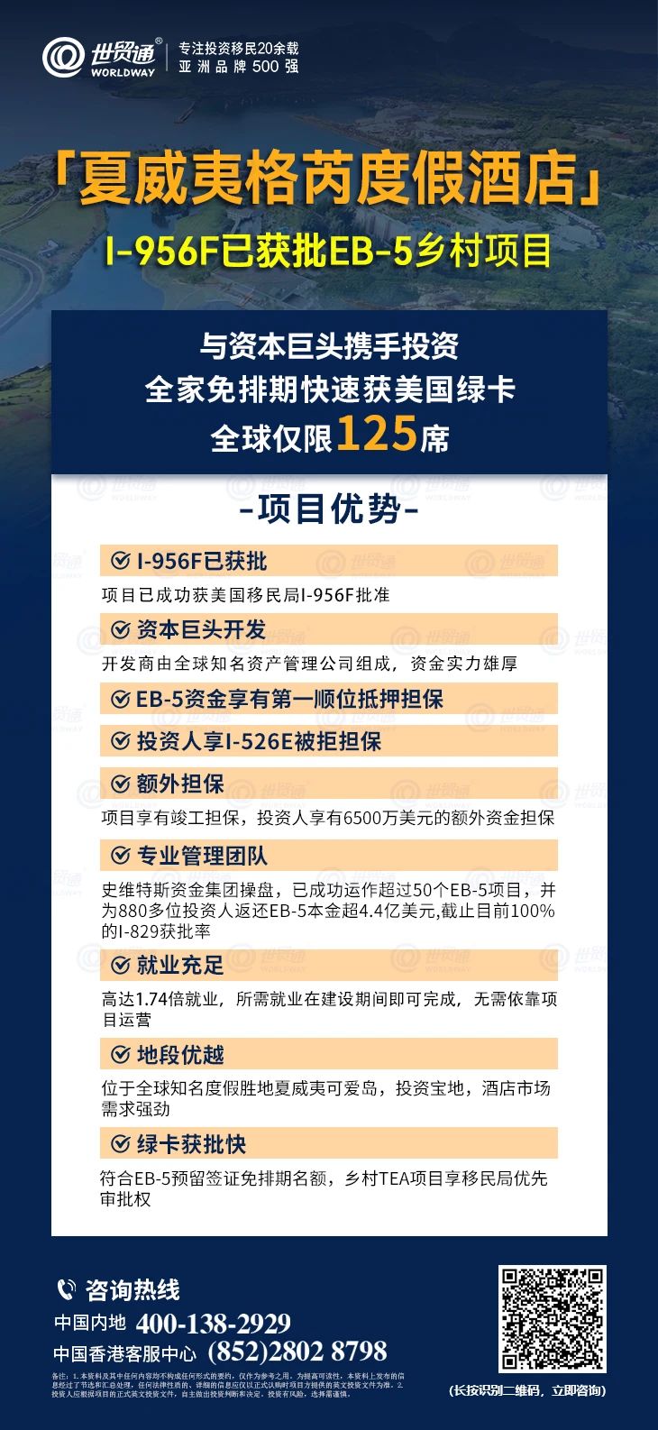 当下,EB-5预留签证通道中的乡村项目是快速获取美国绿卡的优选途径中的优选。目前,市面上热销的两大精品EB-5项目,I-956F及I-526E实案双获批的「阿斯彭▪科迪亚克公寓」和由资本巨头联手打造的I-956F已获批的「夏威夷格芮度假酒店」,都是经过世贸通集团层层筛选、严格把关后的优质EB-5乡村项目,是您快速移民美国的上佳选择。