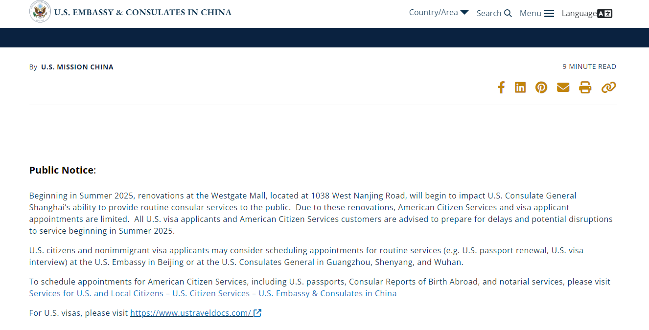 从2025年夏季开始,位于南京西路1038号的西田购物中心将进行翻新,这将影响美国驻上海总领事馆向公众提供常规领事服务的能力。由于这些翻新工作,美国公民服务和签证申请人预约将受到限制。所有美国签证申请人和美国公民服务客户建议从2025年夏季开始的延迟和潜在服务中断做好准备。