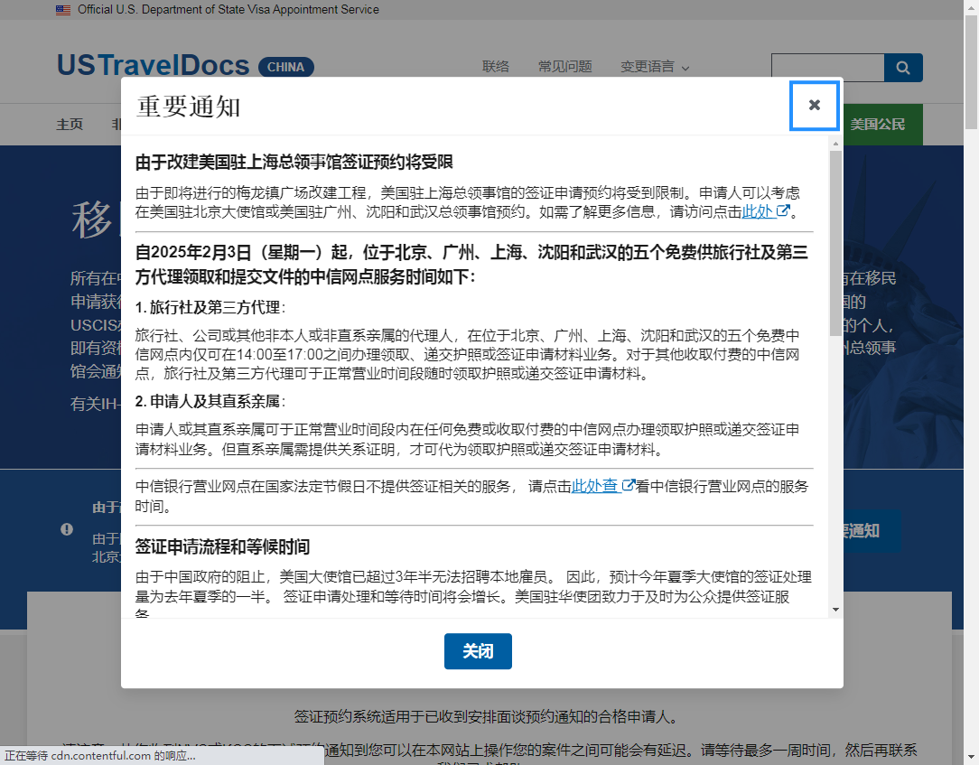 美国公民和非移民签证申请人可以考虑在美国驻北京大使馆或美国驻广州、沈阳和武汉总领事馆安排常规服务(例如美国护照更新、美国签证面谈)的预约。