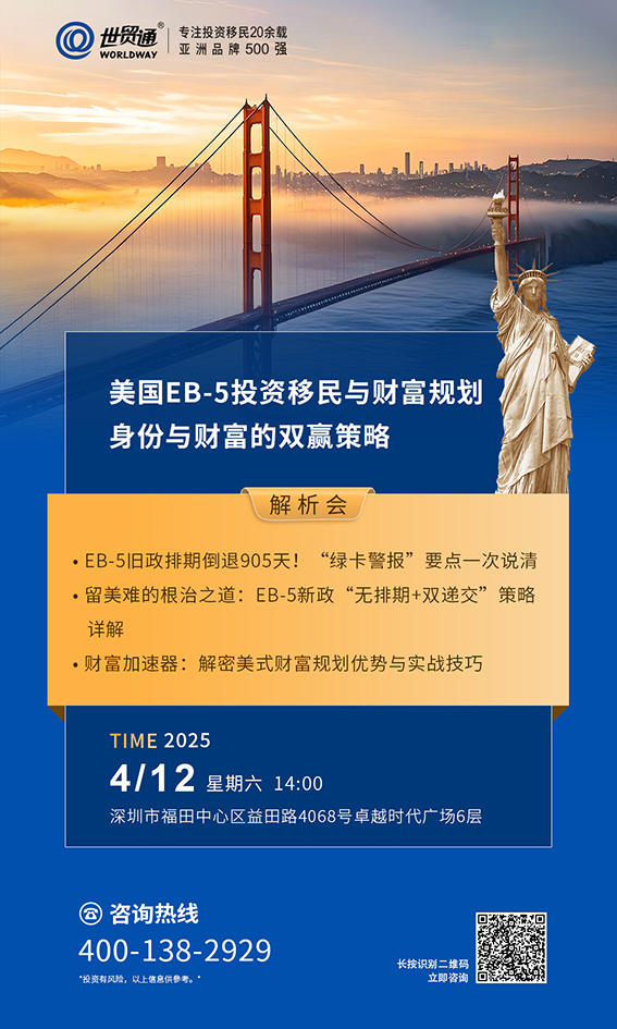 美国EB-5投资移民与财富规划解析会2025年4月12日• 世贸通• 657 阅读 详询咨询 中国内地: 400-138-2929中国香港客服中心: (852)2802-8798 投资有风险,以上信息供参考 上一篇2025美本最新申请数据曝光,中国学生怎样突围?下一篇EB-5新法下,这几个选择决定您的绿卡到手速度!