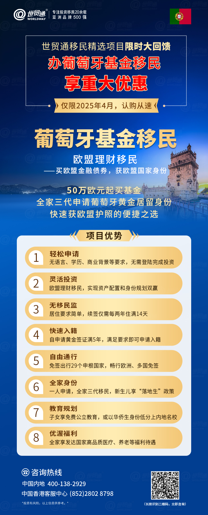 当下正值移民葡萄牙的绝佳时机,为回馈广大客户,世贸通特开展限时大回馈活动,2025 年 4 月 1 日至 4 月 30 日,办理葡萄牙基金移民,享重大优惠!机不可失,时不再来!
