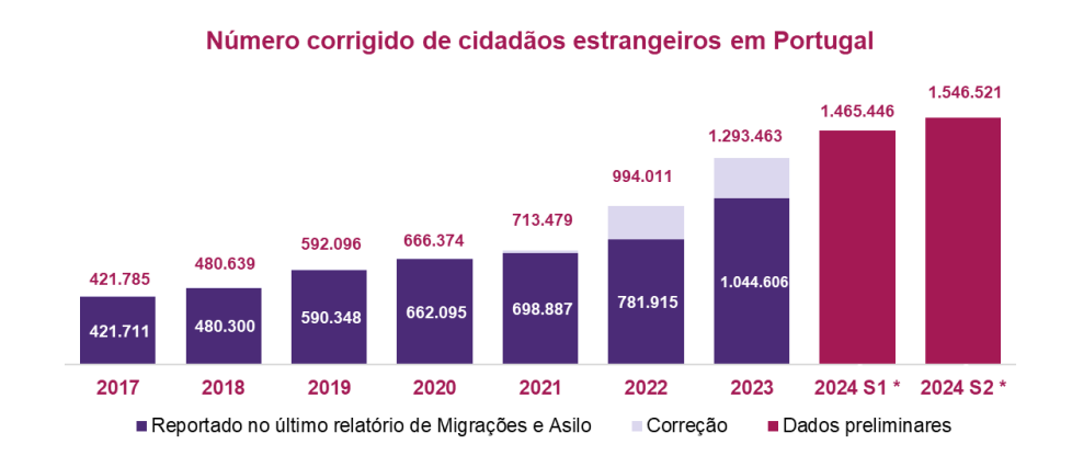 据AIMA发布的一份中期报告预测,截至2024年12月底,葡萄牙境内的移民人数已达160万。与2017年仅42万人相比,7年间增长近4倍。经过对积压案件的整理,AIMA表示:2023年葡萄牙的实际移民人口为1,293,463人,而非《2023年移民与庇护报告》中所指的1,044,606人。