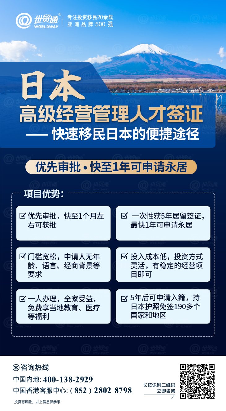 在旅游业繁荣的同时,近年来,日本凭借教育、医疗、环境、福利、养老等方面的优势,受到众多移民投资者的青睐。目前,日本高级经营管理人才签证是快速移民日本的便捷途径,优先审批,快至1年可申请永居。通过学历、工作年限、年龄、年收入等情况进行打分,达到70分即可申请签证。在这次调整中,日本对一些本土学校的加分政策进行了调整,有意向的投资者欢迎联系世贸通,为您进行专业评估。