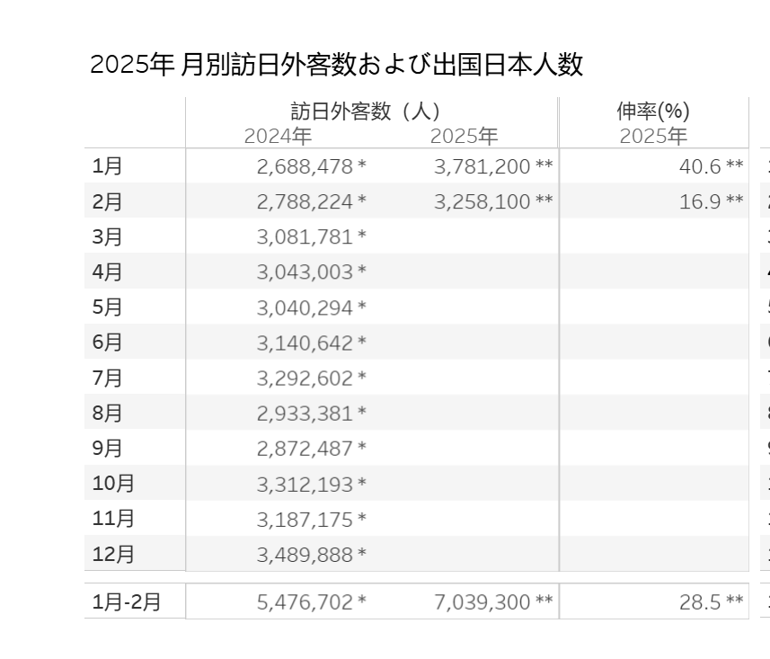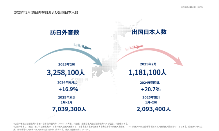 根据日本旅游观光厅数据,2025年1月访日外国游客量达到378万人,对比2024年1月上涨40.6%。2025年2月的访日外国游客人数达到325万人,同比上涨了16.9%。其中,中国大陆游客占比22.2%,中国台湾游客占比15.6%,中国香港游客占比6%,韩国占比26%。