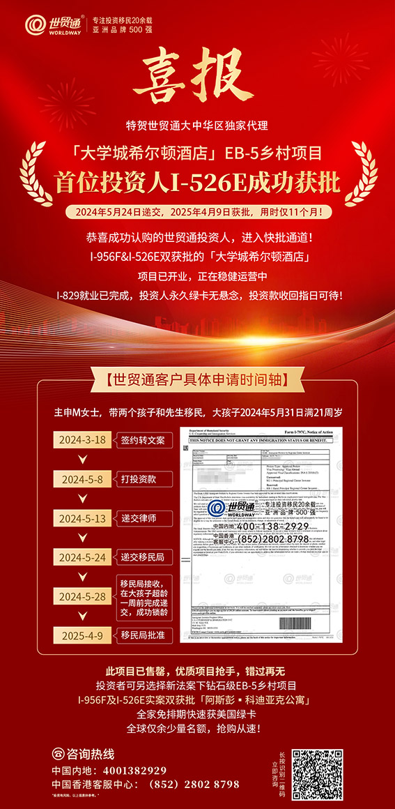 重大好消息!由世贸通担任大中华区独家代理的I-956F已获批的「大学城希尔顿酒店」EB-5乡村项目,迎来首位投资人I-526E成功获批的喜讯。从递交申请到I-526E获批,仅用时11个月,这一速度再次彰显了EB-5新政下审批流程的高效性。世贸通恭喜投资人成功通过EB-5投资“过三关”中的“审批及排期关”。不仅如此,目前该项目的I-829就业已完成,投资人永久绿卡无悬念,这就意味着“绿卡关”也胜券在握。如今,投资人已顺利通过两关,投资款收回也指日可待。