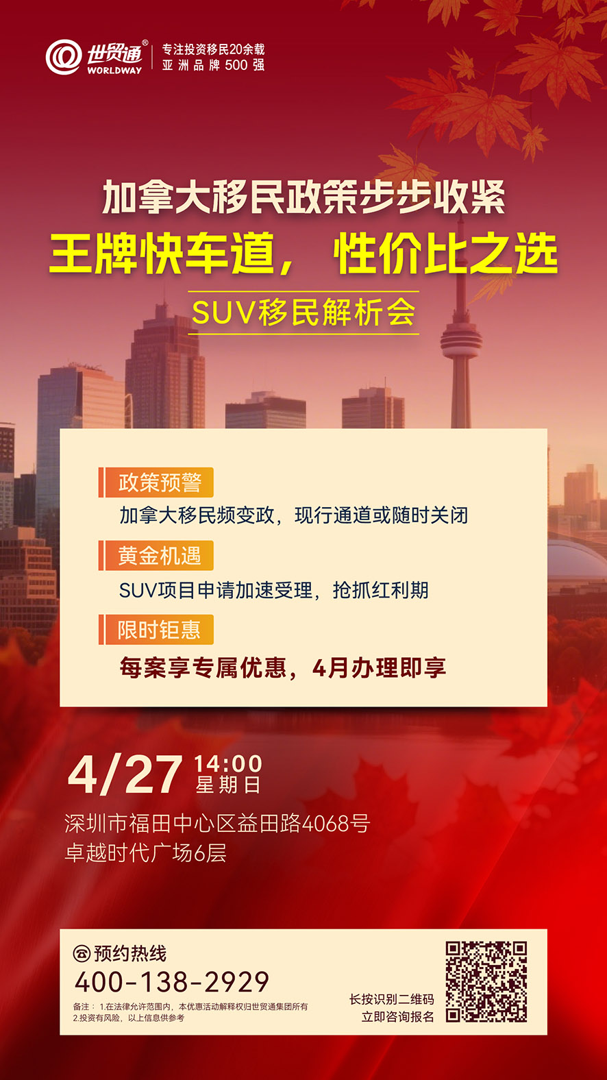 SUV移民解析会2025年4月27日• 世贸通• 730 阅读 详询咨询 中国内地: 400-138-2929中国香港客服中心: (852)2802-8798 投资有风险,以上信息供参考 上一篇智取美加身份说明会下一篇突发!美国将对这类申请人“全面拒签”