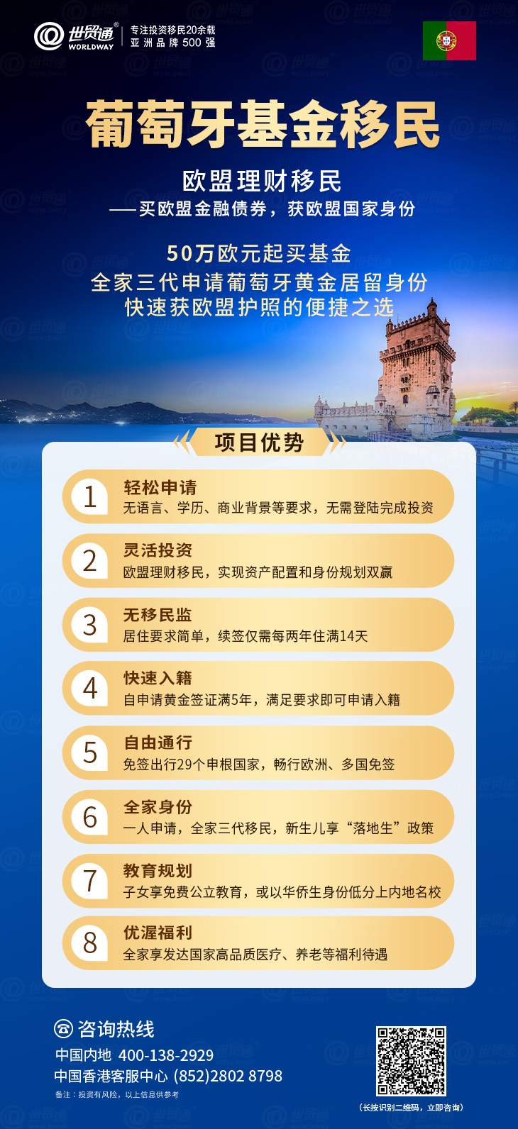 葡萄牙护照持有者可直接在31个欧洲国家自由居住、工作和学习,并在约15-20个其他国家通过简化程序获得长期居留权。作为最早在中国推广葡萄牙黄金居留计划的移民机构之一,世贸通创造了中国首例葡萄牙黄金签证投资人,成功申请葡萄牙欧盟护照的成功案例。在当前欧洲移民政策不断收紧的大背景下,世贸通在此提醒各位投资人,尽早采取行动,抢占先机,把握政策红利优势,早日圆梦欧洲!