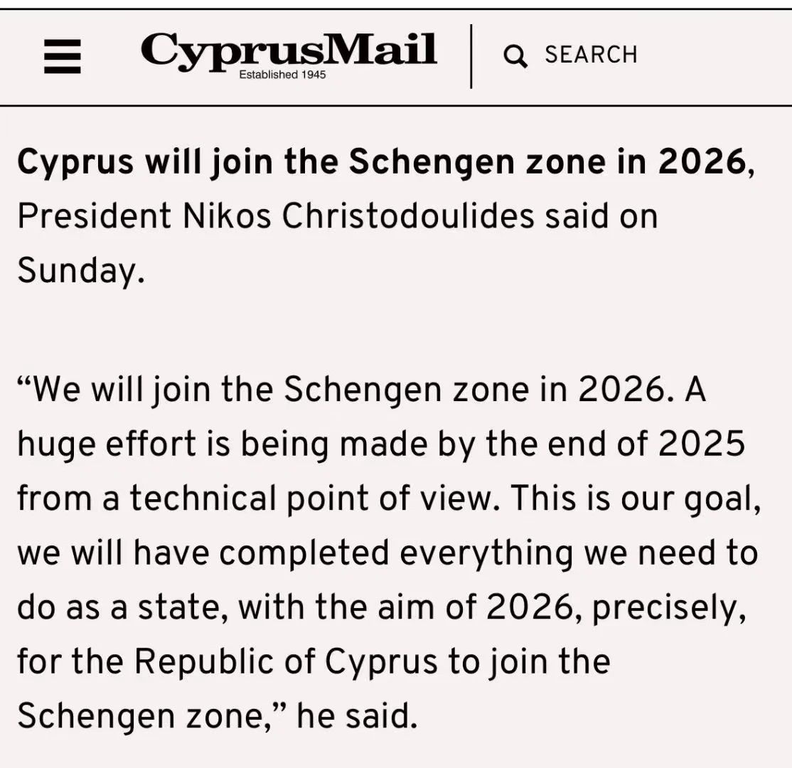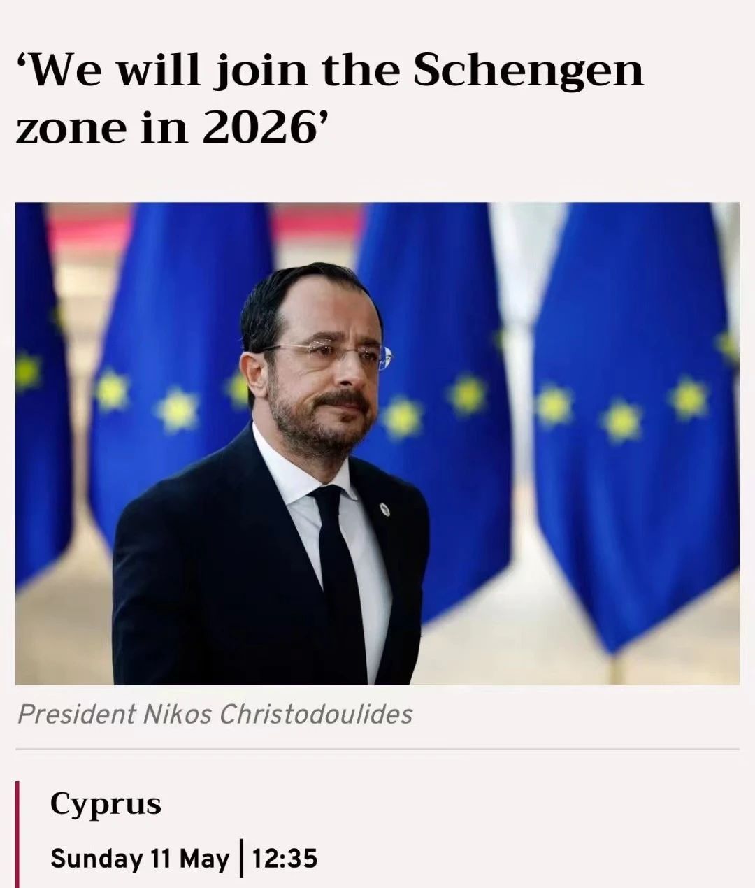 近日,塞浦路斯总统在一场活动上再次宣布:“塞浦路斯将于2026年加入申根。”