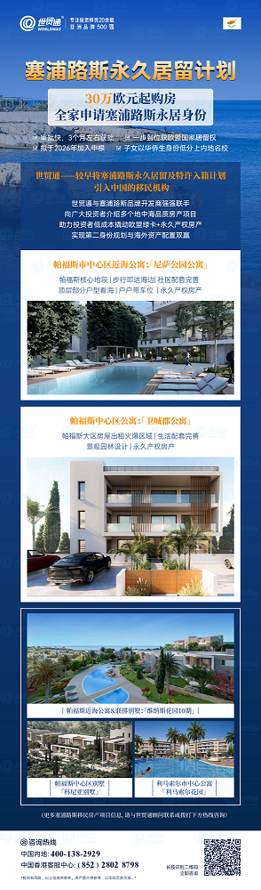 目前,投资30万欧元起,全家申请塞浦路斯永居身份,孩子可享免费公立义务教育,且能以华侨生身份回国报考,轻松入学985、211等一流名校。同时,获得塞浦路斯永居身份,满足相关条件之后,还可申请塞浦路斯欧盟护照。政策红利窗口期有限,世贸通建议广大有意向的投资人把握机会,尽早行动。