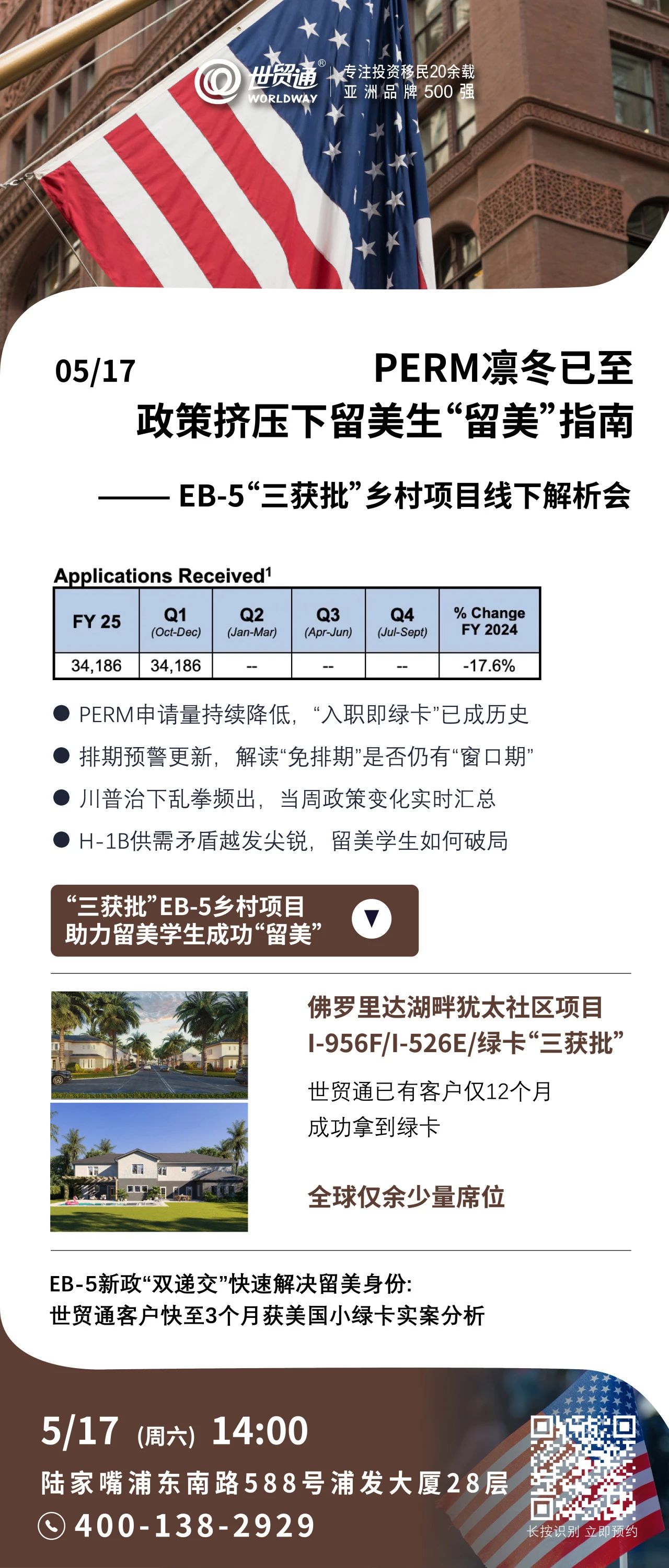 EB-5“三获批”乡村项目线下解析会2025年5月17日• 世贸通• 314 阅读 EB-5“三获批”乡村项目线下解析会 详询咨询 中国内地: 400-138-2929中国香港客服中心: (852)2802-8798 投资有风险,以上信息供参考 上一篇葡萄牙捐赠/基金投资移民下一篇H-1B抽签vs 留美:碰运气还是拼战术?