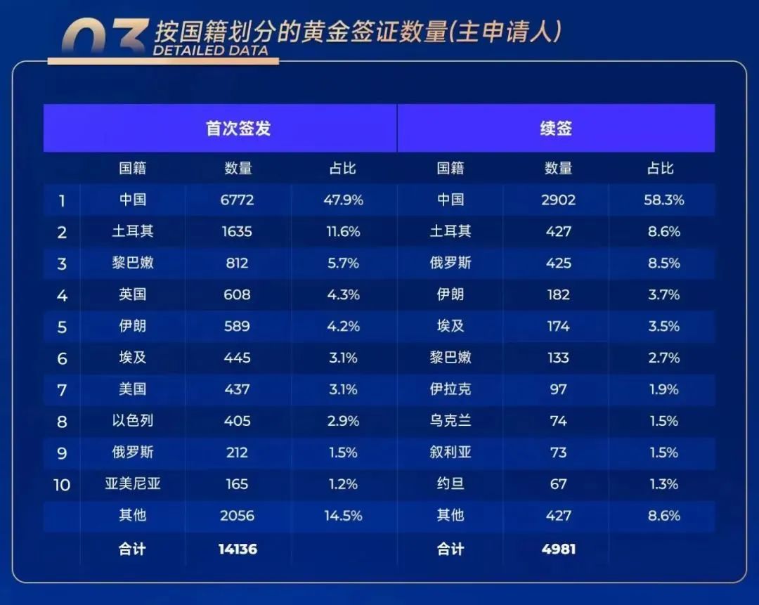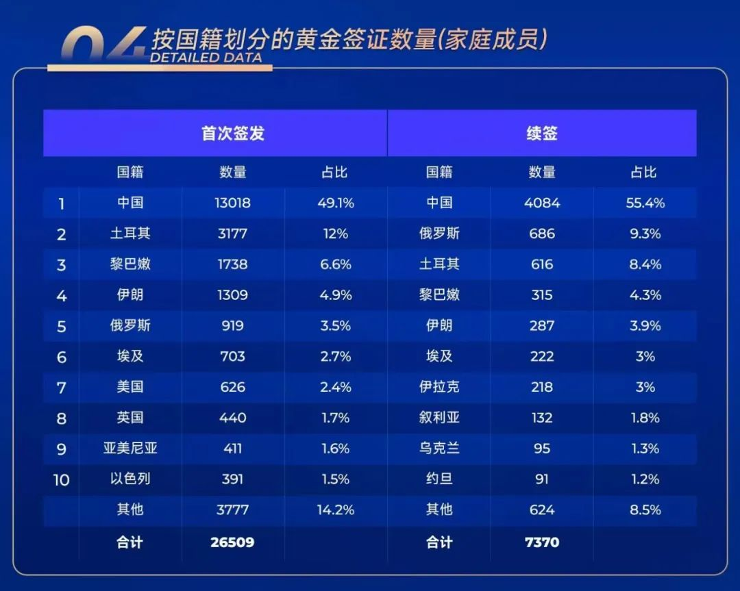 中国仍是持有黄金签证人数最多的国家。按国籍划分的黄金签证数量(主申请人)中,中国家庭以6772份申请、47.9%的绝对占比稳居榜首。这意味着每两个申请希腊黄金签证的外国投资者中,就有一个来自中国。