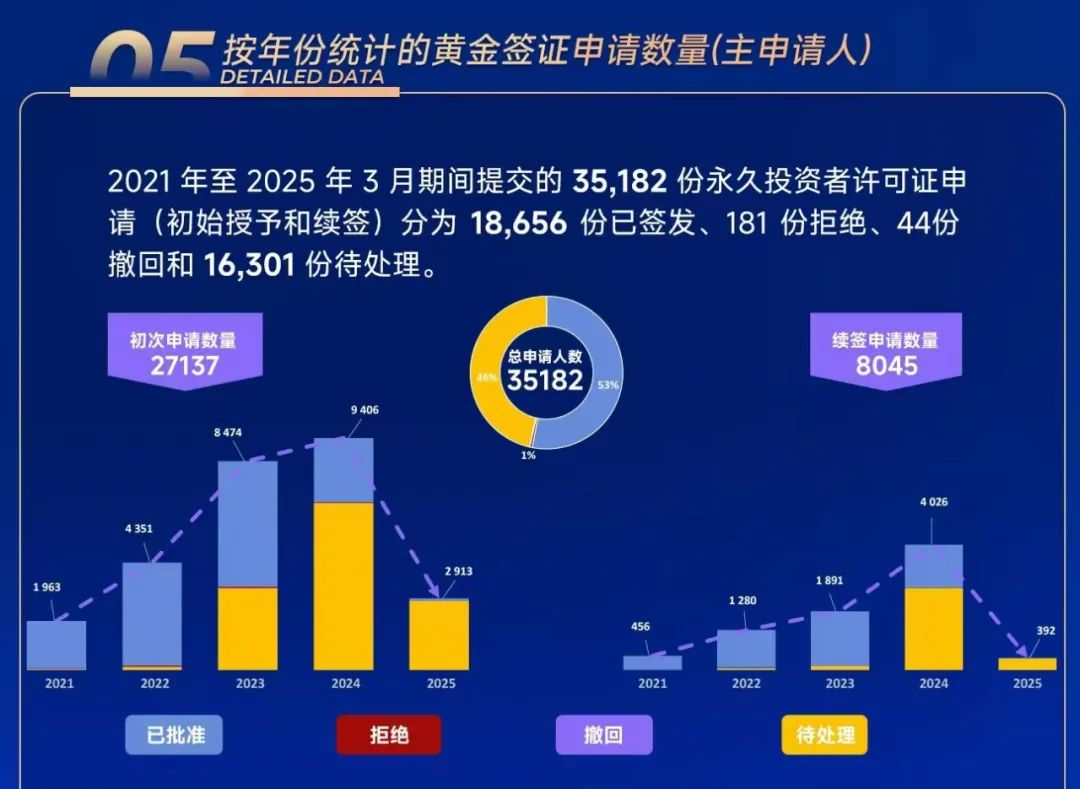 数据显示,2021年至2025年3月31日,希腊黄金签证项目累计接收了35182份申请,其中18656份已签发,16301份待办。其中,2024年3月至2025年3月,这一年间共接收了14958份黄金签证申请,目前已有3411份已获批。