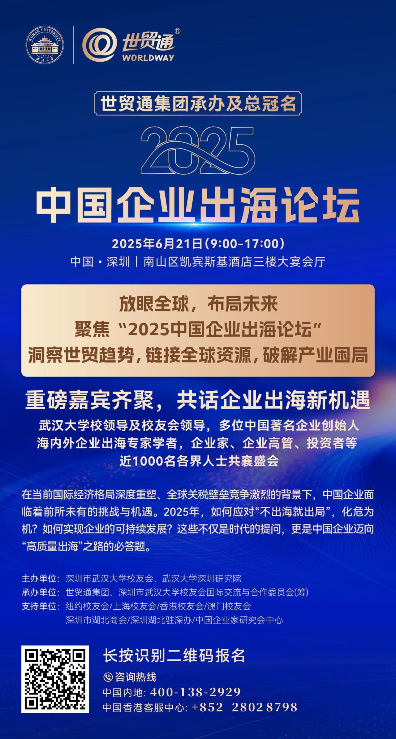 在此背景下,由深圳市武汉大学校友会、武汉大学深圳研究院主办,世贸通集团、深圳市武汉大学校友会国际交流与合作委员会(筹)承办的“2025中国企业出海论坛”将于2025年6月21日,在深圳隆重举行!这不仅是一场汇聚业界精英的盛会,更是中国企业迈向 “高质量出海”征程中的重要里程碑。
