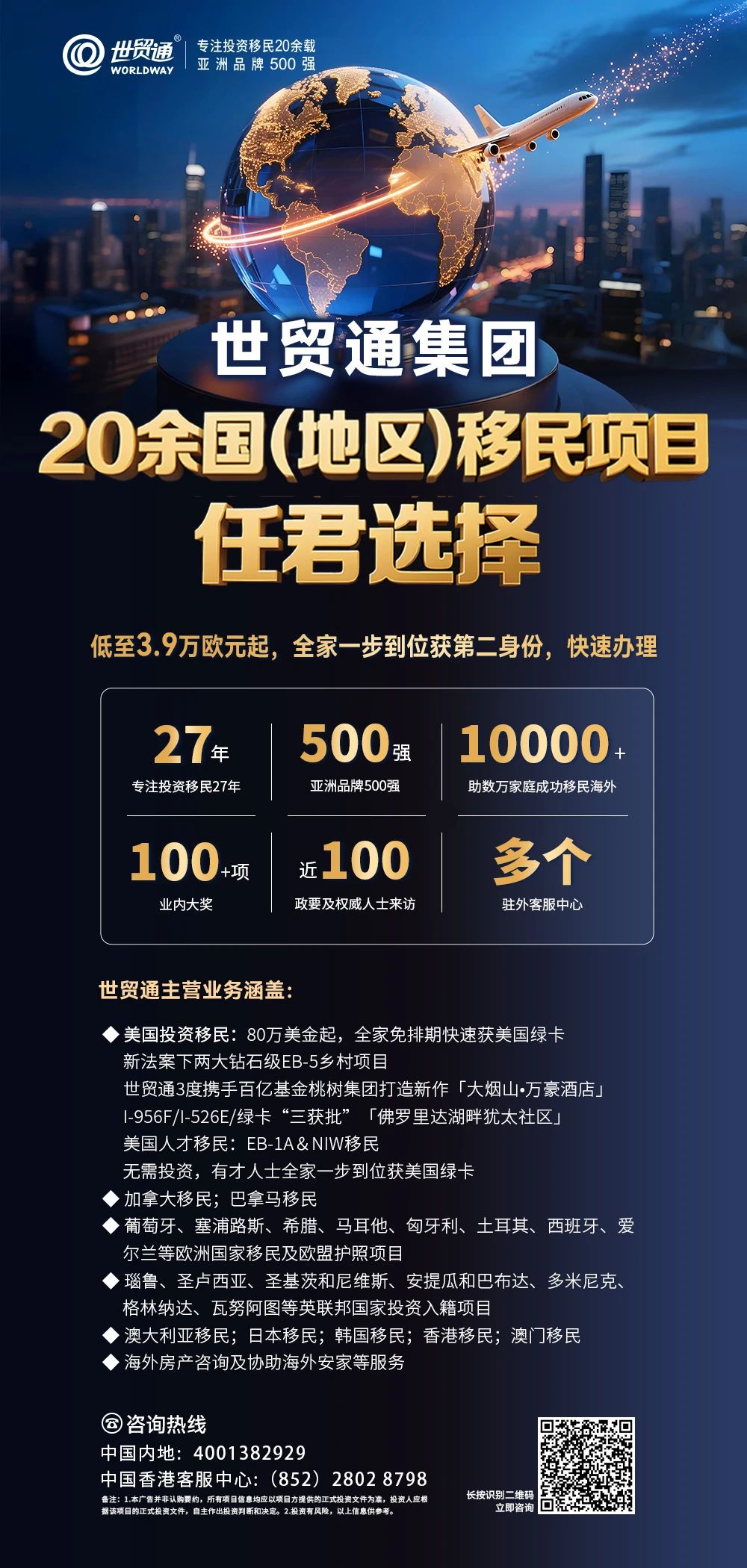 世贸通集团,亚洲品牌500强,专注投资移民20余载,自成立以来,始终秉持“诚信为本,客户为尊”的理念,谨慎选择项目,专业服务客户,屡获殊荣。这份成就离不开社会各界和广大客户的支持与肯定,未来,世贸通将持续深化平台优势,助力中国企业及企业家们把握更广阔的海外机遇,共绘扬帆世界的新蓝图!