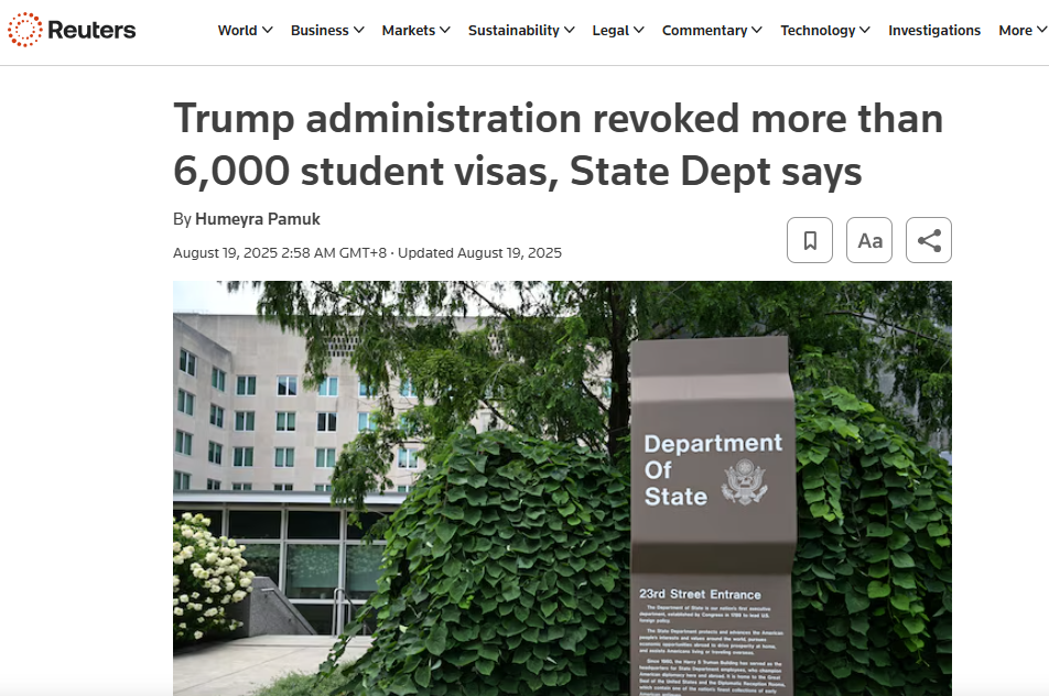 近日,美国多家媒体披露,美国国务院于2025年撤销超过6000份国际学生签证,引发广泛关注与担忧。与此同时,有数据显示,美国在2025年春季已撤销超过4700名在美外籍学生的合法身份,许多人甚至毫无预警地被剥夺了合法留美资格。