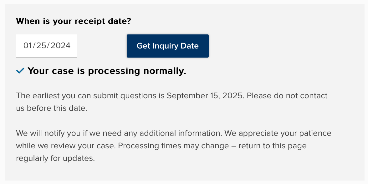 移民局同步公布了可进行询案(Make an Inquiry)的时间点。对于I-526E申请,只有当你的案件收件日期(Receipt Date)早于2024年1月25日时,才意味着其处理速度慢于93%的同类案件,届时方可联系移民局查询催办。这为申请人提供了一个清晰的操作边界。