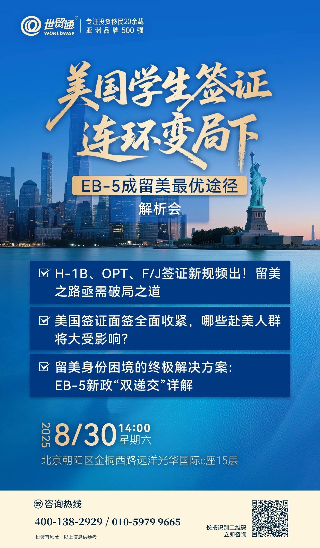 美国学生签证连环变局下EB-5成留美最优途径解析会2025年8月30日• 世贸通• 998 阅读 美国学生签证连环变局下EB-5成留美最优途径解析会 详询咨询 中国内地: 400-138-2929中国香港客服中心: (852)2802-8798 投资有风险,以上信息供参考 上一篇重磅!新西兰推出全新投资者签证下一篇美国签证重磅新规!F/J/I类持有者速看