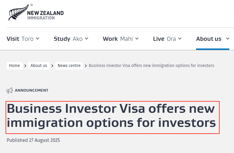 当地时间2025年8月27日,新西兰移民局宣布推出新的商业投资者签证(Business Investor Visa,简称BIV)。该签证将自 2025年11月起正式接受申请,为全球投资者提供新的移民通道。这是继今年4月“积极投资者签证(AIP)”出台后,该国投资移民政策的又一次重大调整!