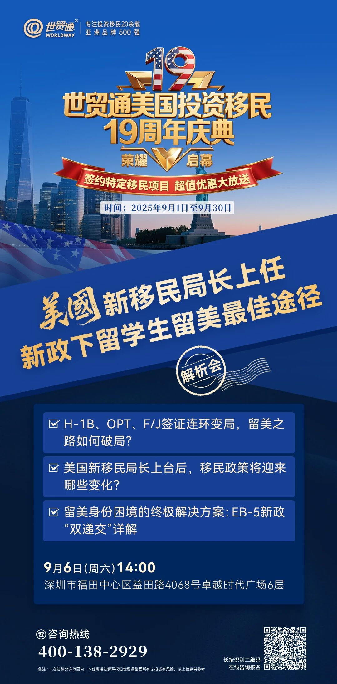 美國新移民局长上任,新政下留学生留美最佳途径2025年9月6日• 世贸通• 1.0k 阅读 美國新移民局长上任,新政下留学生留美最佳途径 详询咨询 中国内地: 400-138-2929中国香港客服中心: (852)2802-8798 投资有风险,以上信息供参考 上一篇“三获批”EB-5乡村项目建设迎重大进展下一篇世贸通&美国新移民联盟助力全美华人网球赛