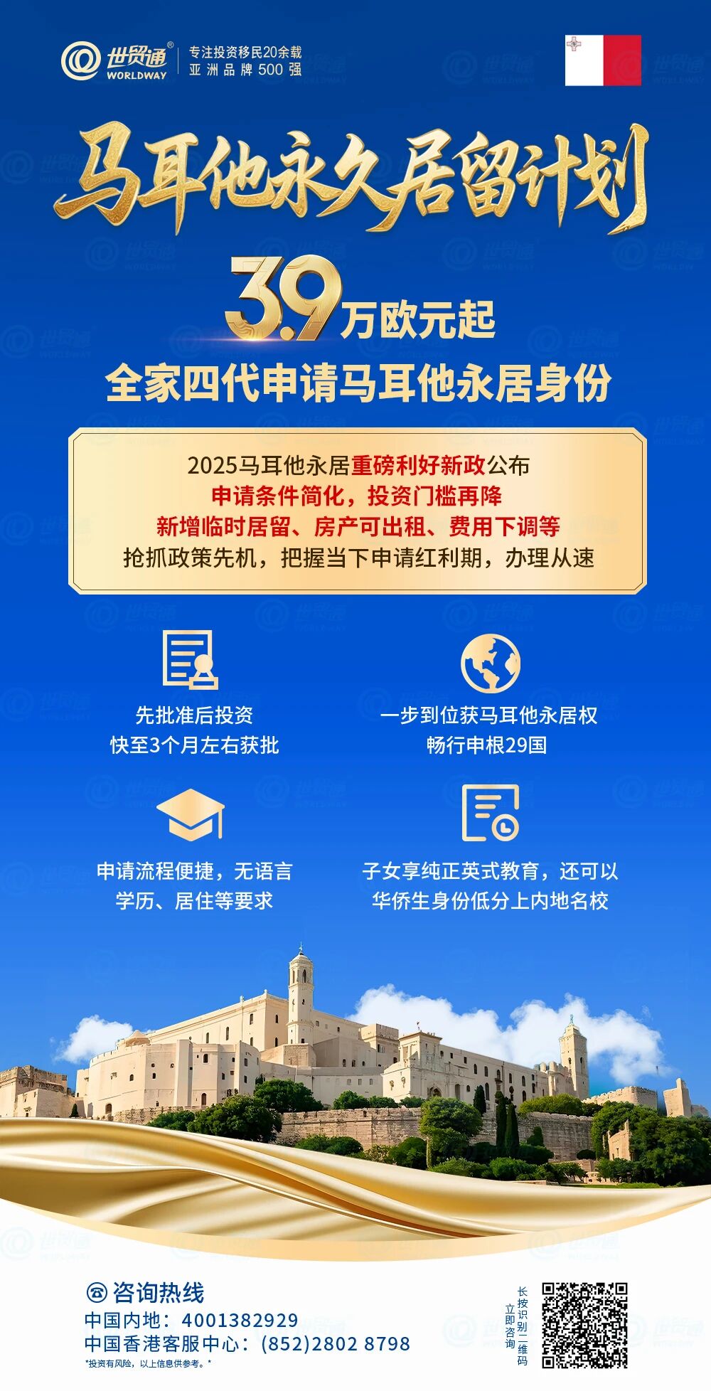 对于想要移民欧洲的投资者而言,仅需投资3.9万欧元起,可全家四代移民马耳他,一步到位获马耳他永居身份!此项目没有语言、学历、经商背景等要求,申请条件简化、操作简单、投资金额低。2025年9月,办理马耳他移民,即享重磅优惠,有意者请抓紧。