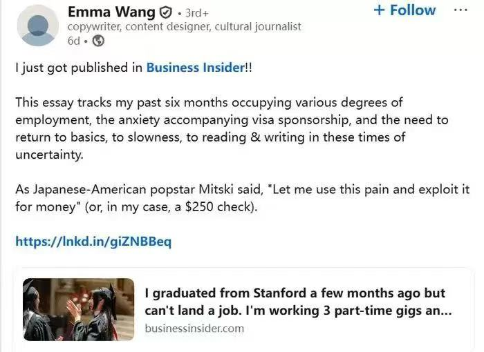 Emma的案例暴露了留学生在美求职的结构性难题,尽管拥有斯坦福这样的顶级名校背景,她仍然在求职路上屡屡碰壁,最终只能依靠三份兼职工作维持生计。