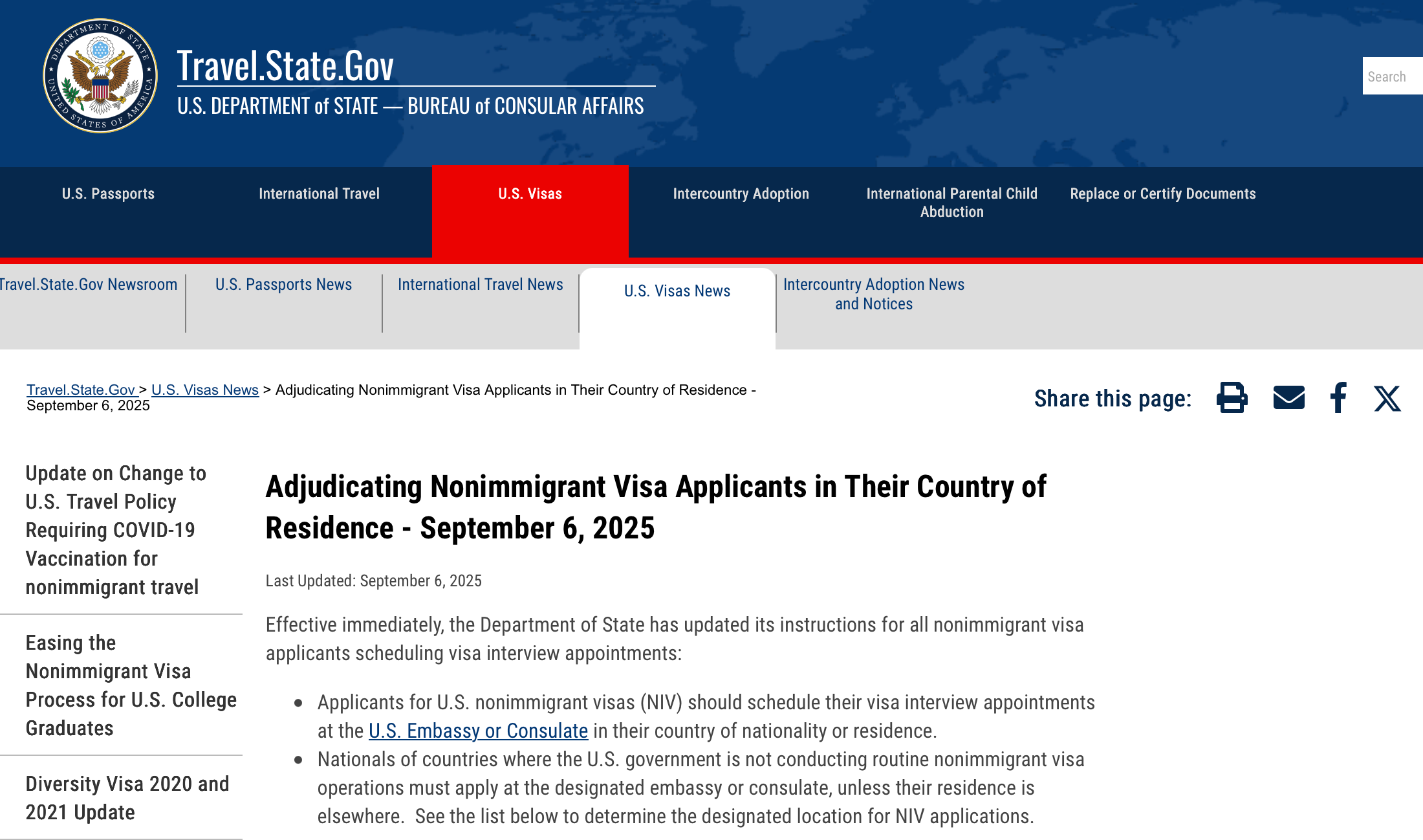 • 必须在国籍国或居住国申请:根据美国国务院发布的最新指引,即日起所有非移民签证申请人(包括B1/B2、F1、H1B、L1等常见类别)必须在其国籍国或合法长期居住国的使领馆提交申请。如以“居住国”为依据申请,需提供长期签证、工作或学习文件等充分证明材料。