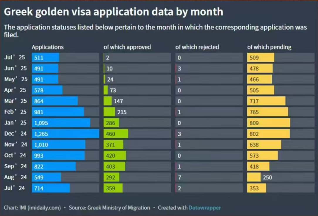 2025年7月,希腊黄金签证项目创下史上最大单月降幅纪录,成功处理2772宗积压案件。自4月起,该项目始终保持“处理量高于接收量”的良性运营状态:当月接收511份申请,批准734宗,审批效率持续领先。