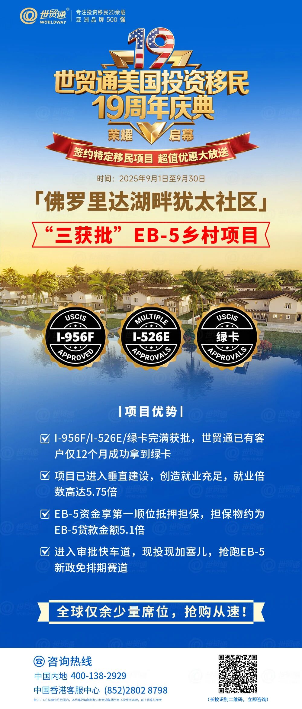 • 「佛罗里达湖畔犹太社区」项目:已实现 I-956F、I-526E、绿卡“三获批”,项目正在全面建设中,当前仅余少量珍贵名额,先到先得,有意向请抓紧。