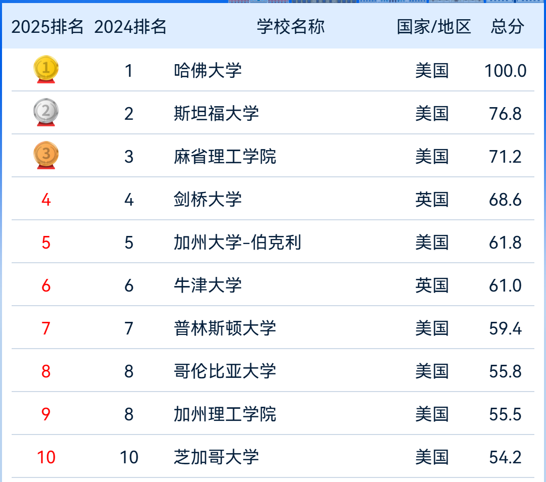 本次排名中,美国高等教育体系的表现可圈可点。哈佛大学延续辉煌,创纪录地连续23年稳居全球第一,彰显了其历久弥新的学术影响力。尤为突出的是,美国院校在百强榜单中一举拿下37个席位,不仅在数量上遥遥领先,更在质量上展现出全方位的卓越水准,印证了美国高等教育体系的深厚底蕴与持续创新力。
