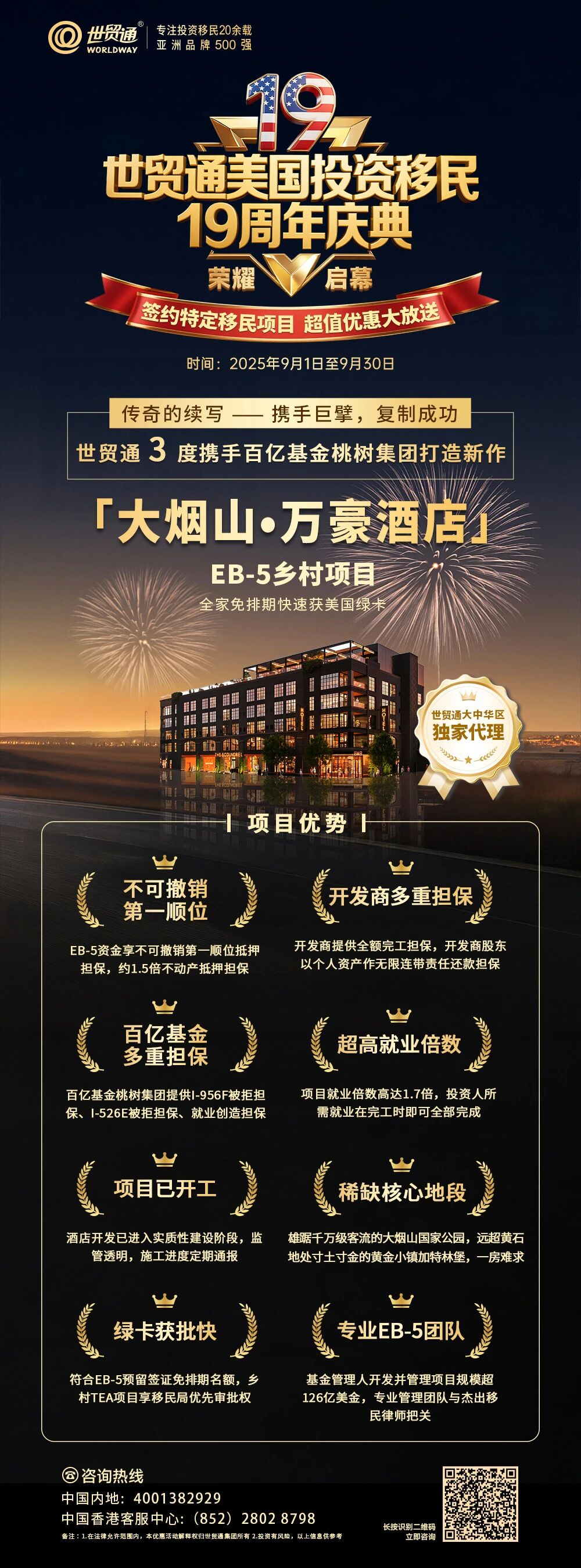 • 「大烟山•万豪酒店」EB-5乡村项目:集众多优势于一身,约1.5倍不动产第一顺位担保+开发商股东以个人资产作无限连带责任还款担保;百亿基金提供I-956F被拒担保、I-526E被拒担保、就业创造担保;就业倍数高达1.7倍;项目雄踞千万级客流的大烟山国家公园,远超黄石;地处寸土寸金的黄金小镇加特林堡,一房难求;项目已开工,酒店开发已进入实质性建设阶段,监管透明,施工进度定期通报,是您全家免排期快速获美国绿卡的优选。