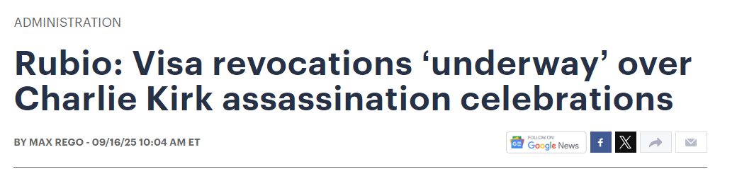 “签证撤销正在进行中。如果你持签证来到美国,却为某位政治人物被暗杀而欢呼,请准备被驱逐出境。”