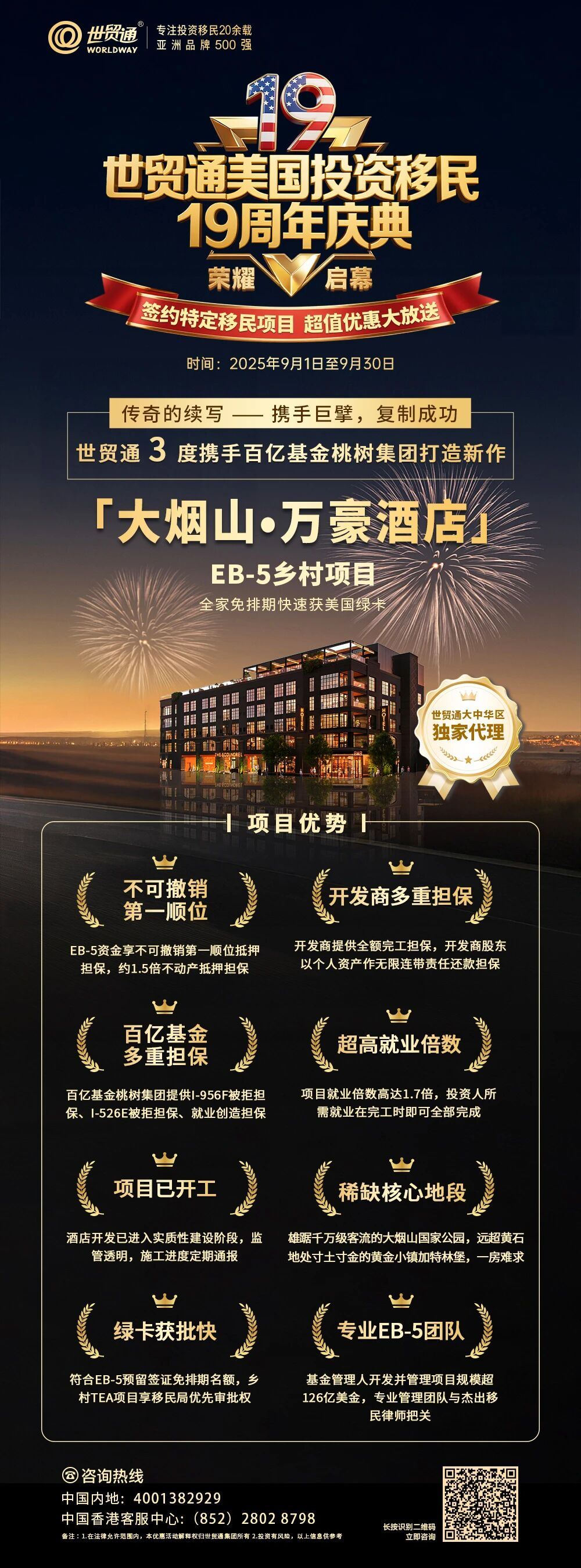 H-1B政策收紧背后,是美国移民体系对“高价值移民”的倾斜。当前,正是规划EB-5移民的黄金窗口期。与其在H-1B的“抽签大战”和“费用飙升”中被动等待,不如主动布局EB-5,为自己和家庭铺就一条确定性更高的美国移民之路。立即行动,咨询世贸通专业EB-5移民顾问,评估您的资格,抓住无排期红利!