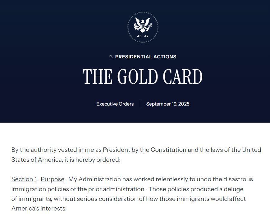 2025年9月19日,美国总统特朗普签署一项名为“金卡”计划的行政令,称其将为“具有非凡能力并愿意支持美国的外国人”开辟一条新的签证通道。