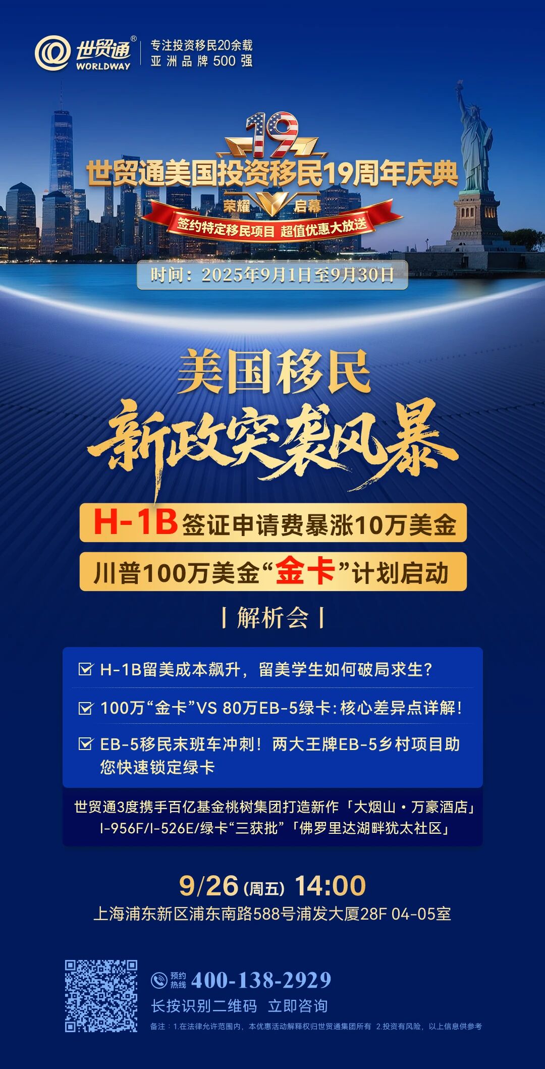 美国移民新政突袭风暴2025年9月26日• 世贸通• 750 阅读 美国移民新政突袭风暴 详询咨询 中国内地: 400-138-2929中国香港客服中心: (852)2802-8798 投资有风险,以上信息供参考 上一篇2026美本大洗牌选校难,H-1B暴涨留下难!下一篇全球首家世贸通推出川普“百万金卡”上海站