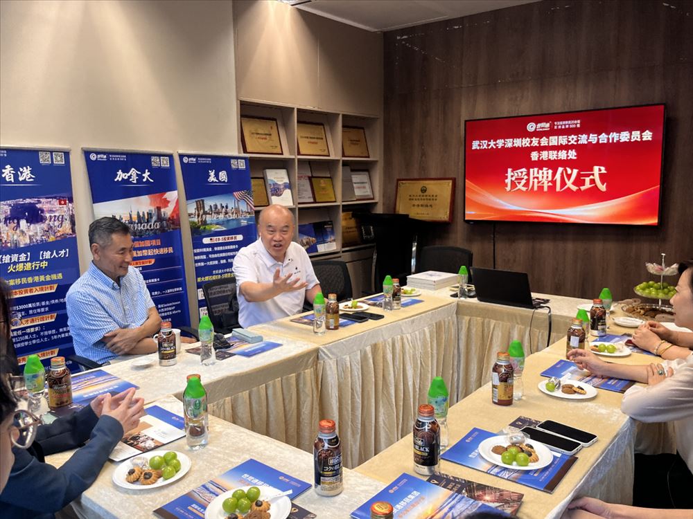 武汉大学深圳校友会国际交流与合作委员会香港联络处授牌仪式在世贸通香港公司举行。出席嘉宾有武汉大学深圳校友会会长刘少雄先生、武汉大学澳门校友会副理事长兼秘书长钟立女士、武汉大学深圳校友会副秘书长陈雪萍女士,以及世贸通集团董事长邢新力博士,世贸通集团高级副总裁、世贸通香港公司董事马莉女士,世贸通集团副总裁何晓如女士,世贸通香港公司总经理刘芳红女士等。
