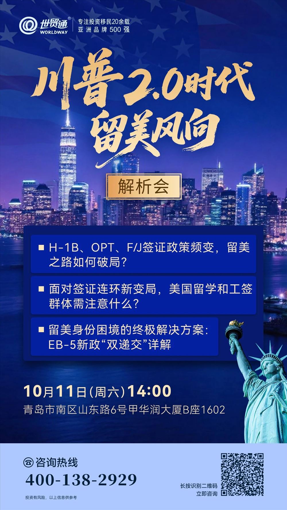 川普2.0时代留美风向解析会 2025-10-01 世贸通移民 737川普2.0时代留美风向解析会 详询咨询 中国内地: 400-138-2929 中国香港客服中心: (852)2802-8798 投资有风险,以上信息供参考
