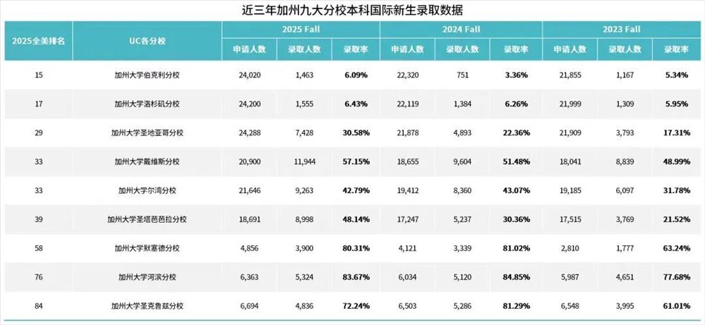 从诺贝尔奖的荣耀到留学的热潮,加州大学体系始终是世界顶尖人才的聚集地。截至2024/25学年,加州大学系统共有约4.1万名国际学生,占总人数的13%;其中中国学生约占43%,印度学生约20%。伯克利、UCLA、UC圣地亚哥三校各自拥有超过一万名国际生,长期位列全球最具吸引力的公立大学之列。
