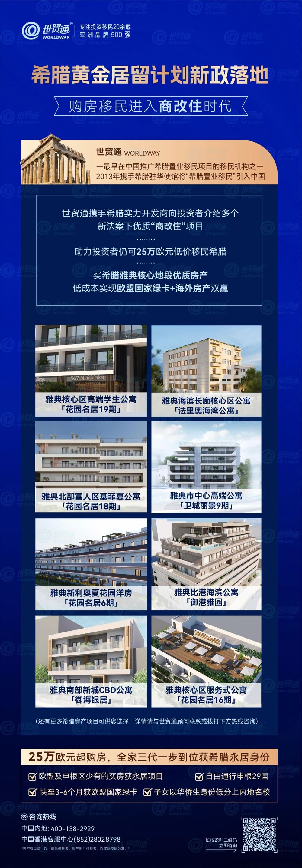 作为目前移民市场上少有的可以快速拿欧盟绿卡的项目,投资者投资25万欧元起的房产,即可一步到位获欧盟国家希腊永居身份!