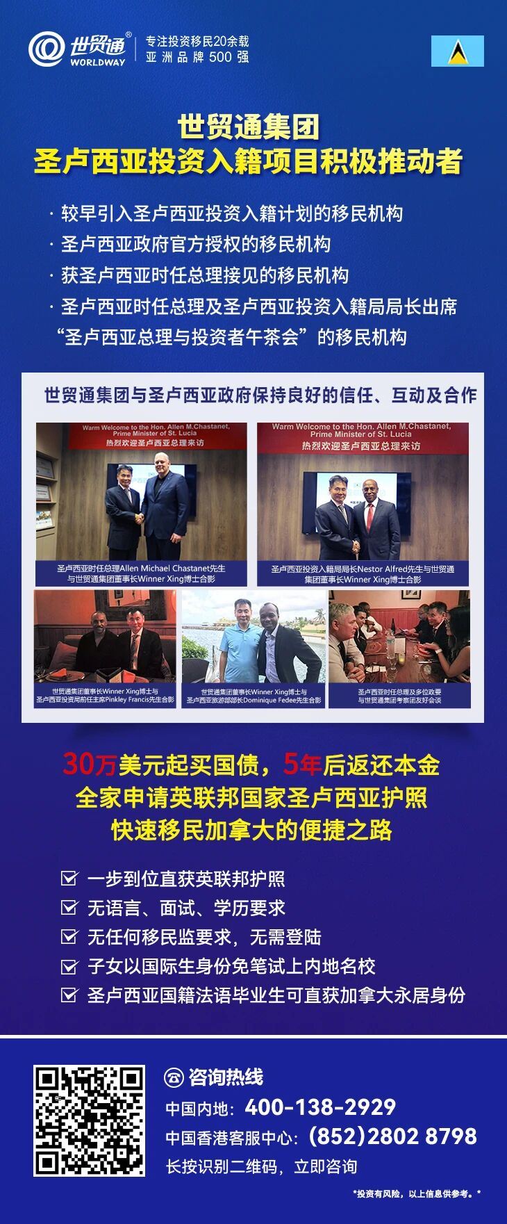 世贸通集团作为圣卢西亚政府授权的专业移民机构,在英联邦国家投资入籍项目推广方面拥有丰富的经验和众多成功案例。作为英联邦国家投资入籍项目的积极推动者,世贸通早在本世纪初就已开展英联邦国家快速入籍项目推广,是最早在中国推广英联邦国家投资入籍项目的移民公司之一。