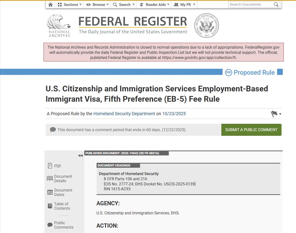 2025年10月23日,美国国土安全部(DHS)与移民局(USCIS)在联邦公报发布了一份EB-5移民签证收费新规草案。