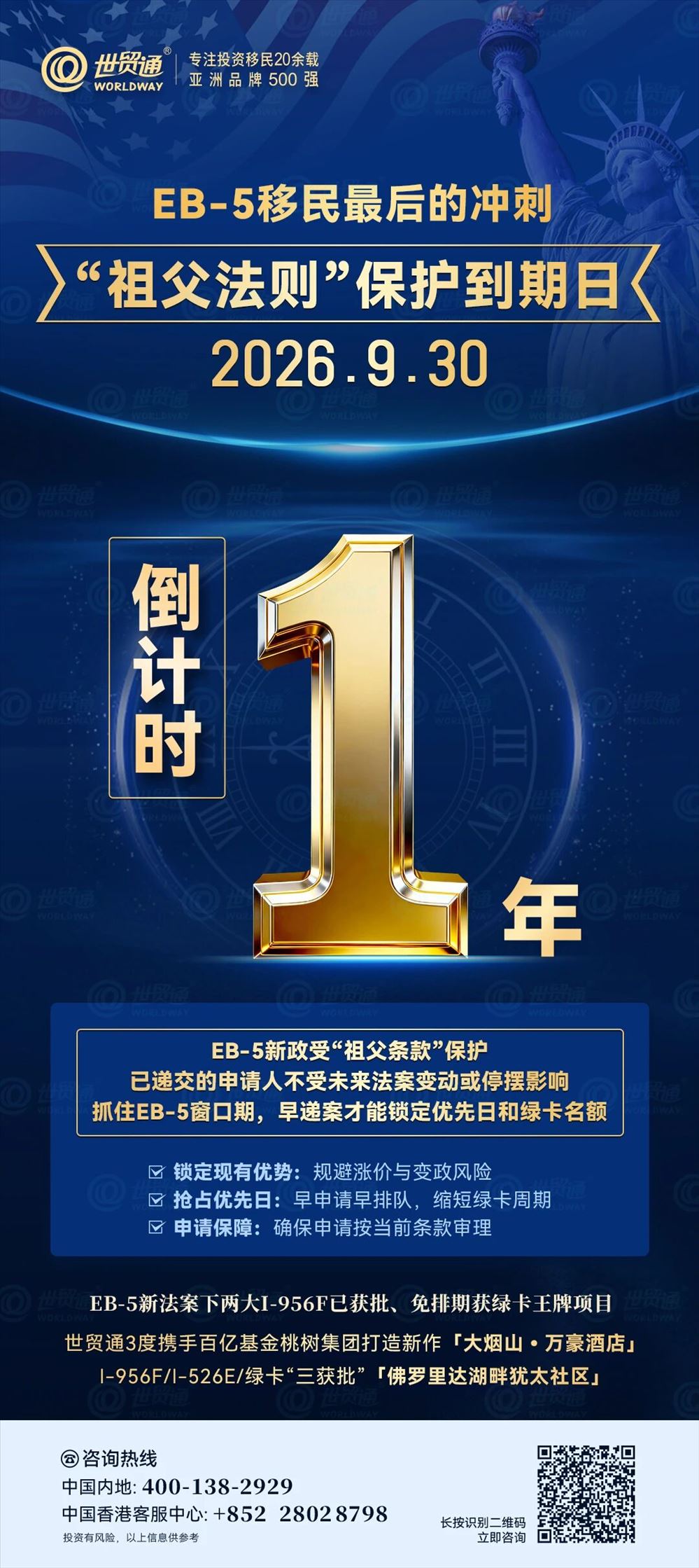 值得注意的是,EB-5祖父法则已进入最后一年倒计时(2026年9月30日到期)。在此日期前递交的申请将受现行政策保护。机遇稍纵即逝,越早递交,越稳妥!