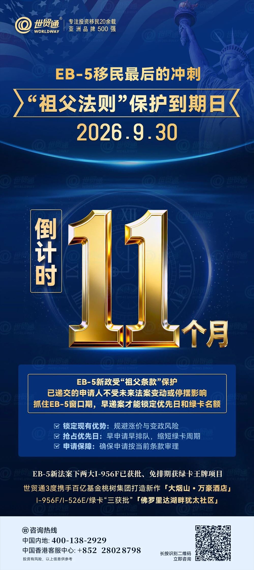 值得注意的是,EB-5祖父法则已进入最后11个月倒计时(2026年9月30日到期)。在此日期前递交的申请将受现行政策保护。机遇稍纵即逝,越早递交,越稳妥!