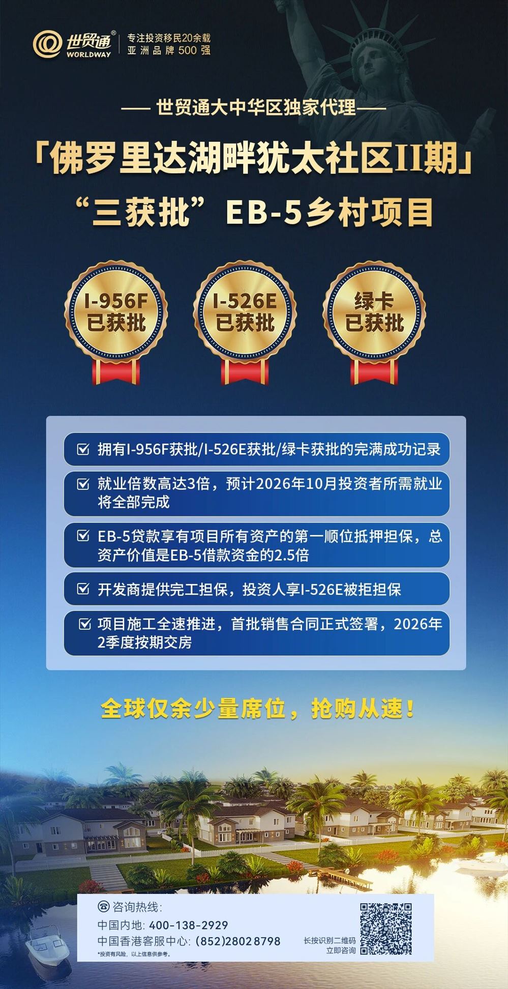 我们自豪地宣布,由世贸通担任大中华区独家代理的优质EB-5乡村项目——「佛罗里达湖畔犹太社区Ⅰ期)」项目已全部售罄!这不仅彰显了市场对优质乡村项目的强劲需求,更再次印证了世贸通在EB-5领域的专业实力与品牌影响力。一期项目火热售罄二期项目持续热选「佛罗里达湖畔…