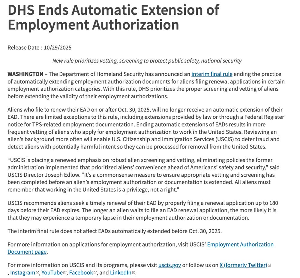 当地时间10月29日,美国国土安全部(DHS)在《联邦公报》发布公告:自2025年10月30日起,取消EAD工卡的“自动延期”政策。这意味着,此前实施、并被拜登政府延长至540天的自动延期政策正式终止。