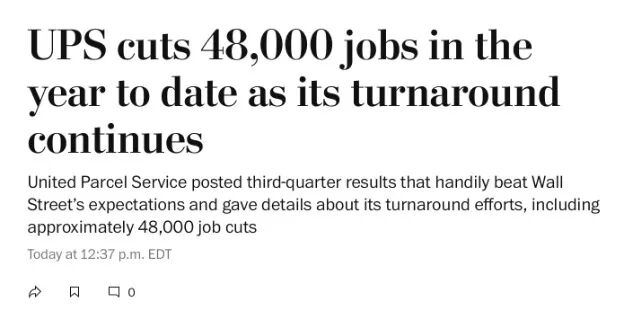 美国物流巨头UPS近日也宣布,今年以来已削减3.4万个运营岗位,再加上年底前将被裁的 1.4 万个管理岗位,全年总共裁员约4.8万人。公司称,这是其史上最大规模的成本优化计划。