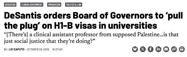 近日,佛罗里达州州长Ron DeSantis宣布,要求州立大学系统全面停止雇用持H-1B签证的外籍员工,理由是“应优先雇用本地人”。据美国移民局(USCIS)数据,截至2025年6月30日,佛罗里达州共有超过1900家雇主赞助7200多名H1-B签证持有者。